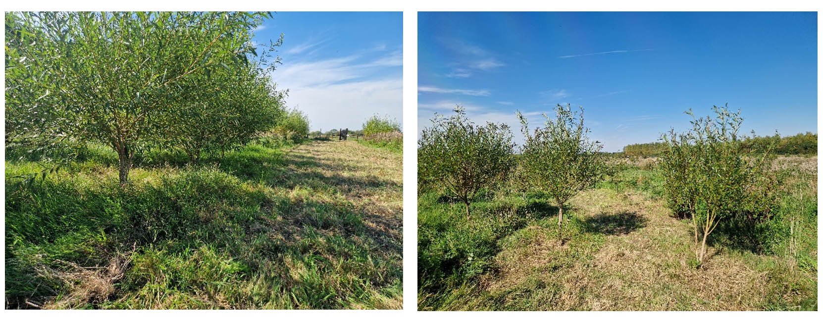 One of the challenges raised was how to ensure that the saplings had enough moisture and kept weed-free. At Eastbrook, they used wood chippings from willow pollarding around the tree bases, typically applying a 5 cm layer. However, an accidental experiment one year saw some trees that received a 75 cm deep pile left around their bases grow 2-3 times higher than other trees planted the same day but with the 5 cm mulch layer (see pictures below – left-hand trees received a deep mulch).
