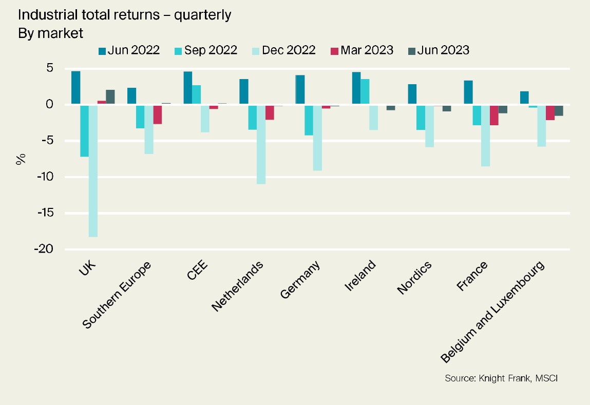 Quarter-on-quarter comparisons show positive returns for some markets, including the UK, CEE and Southern Europe (Q2 2023, MSCI Quarterly European Index). European industrial capital values were down -17.7% y/y in Q2 2023, likely representing a peak-to-trough fall for many markets. However, some markets are further ahead in their repricing journey, and some have repriced more severely than others. Between Q2 2022 and Q1 2023, the UK saw a -25.9 % fall in capital values before positive capital growth returned in Q2 2023.