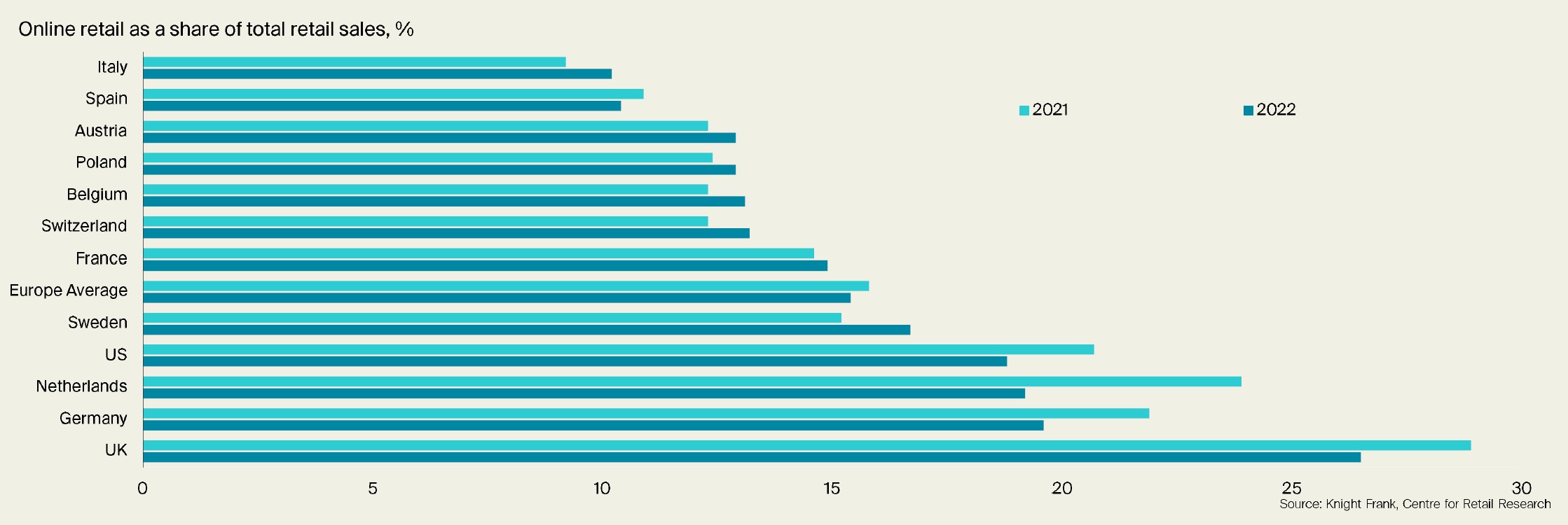 The UK had an online penetration rate of 26.5% in 2022. UK retailers such as Next and John Lewis & Partners now derive only a minority of their sales from their retail premises. However, in Italy, online sales accounted for just 10.2% of total retail sales last year and 10.4% in Spain.