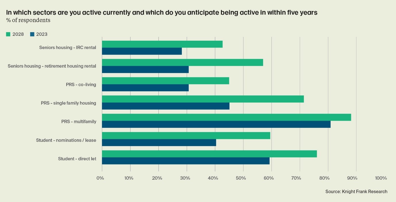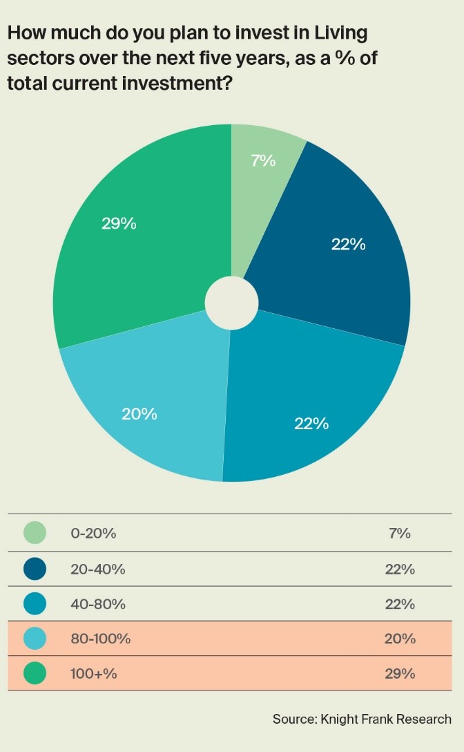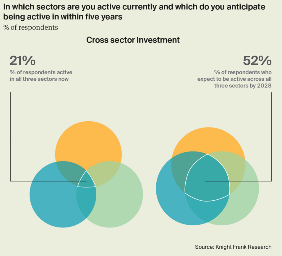 Whilst just 21% of survey respondents currently invest across all three primary Living sectors, this is expected to rise to 52% by 2028. While there are differences in market drivers, the desire for diversification within the Living sectors reflects the fact there are also synergies, particularly with regards to construction and operations.