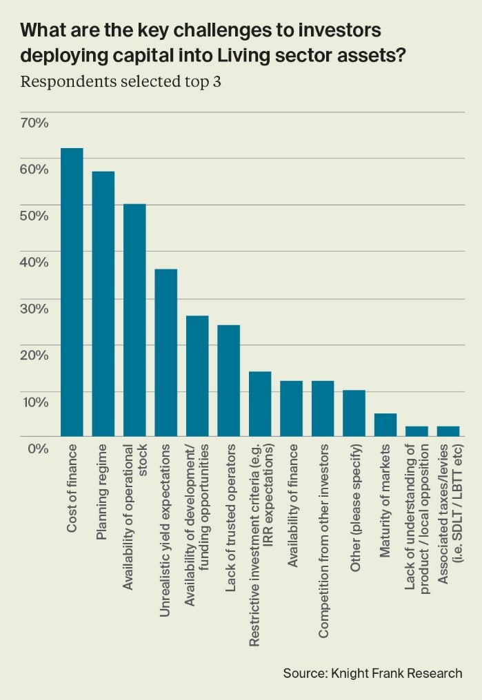 Some 62% of investors highlighted the cost of finance as a major challenge to deploying capital into the Living sectors, reflecting the sharp rise in debt costs over the past 12 months which has resulted in some investors temporarily pressing pause. Investors are also facing challenges around planning, with 57% highlighting this as an issue, up sharply from 36% in last year’s survey.