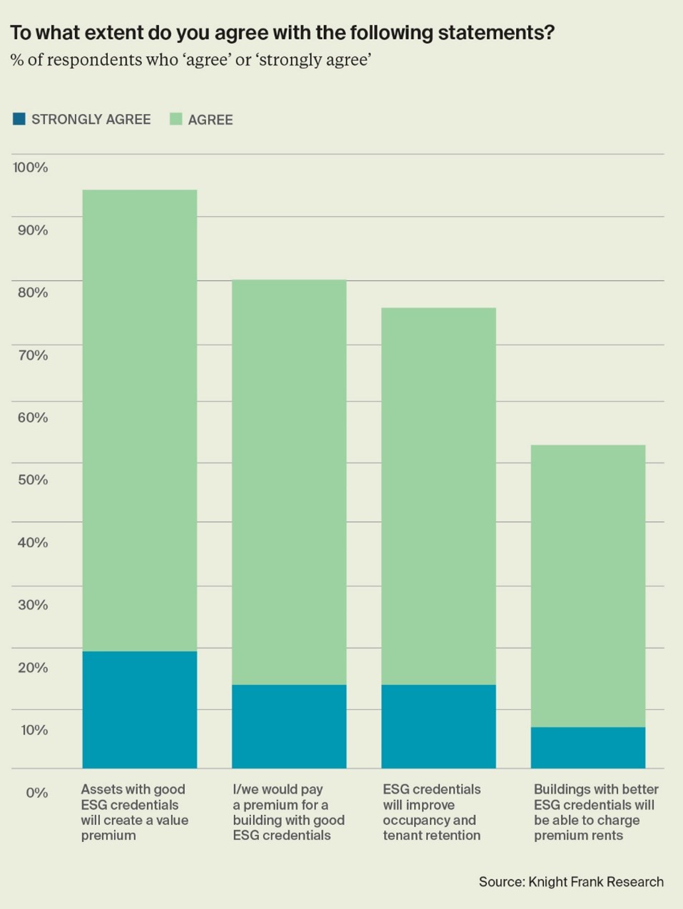 Competition for green buildings is set grow. Some 95% of our respondents agree that ESG credentials will create a value premium for assets, while 81% indicated that they would pay a premium for schemes with strong environmental and sustainability credentials.