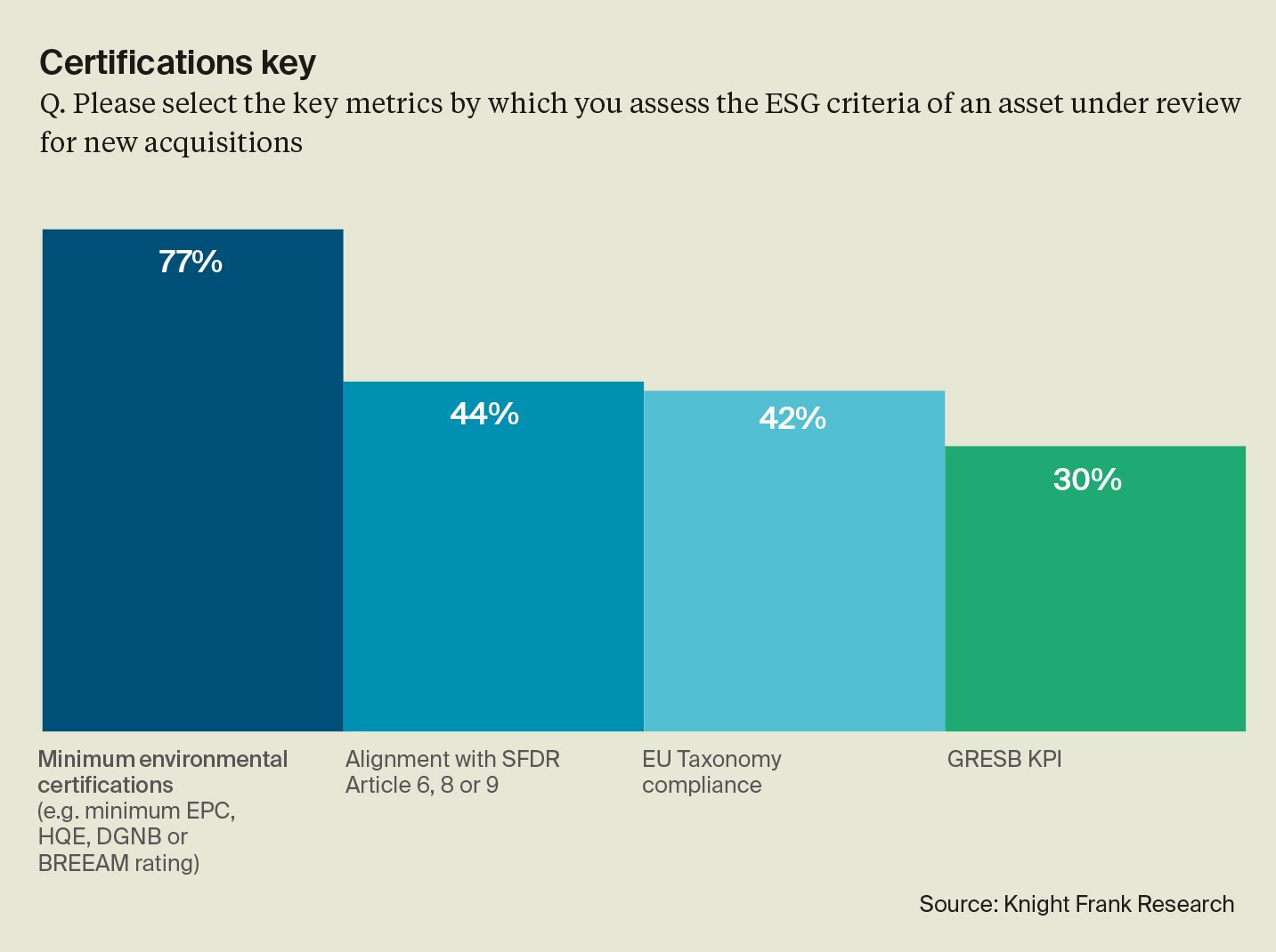 There are 77% of surveyed investors that have a minimum environmental criteria for new acquisitions. Of those targeting EPCs, over 50% require a minimum B rating, the proposed minimum energy efficiency rating in the UK from 2030.