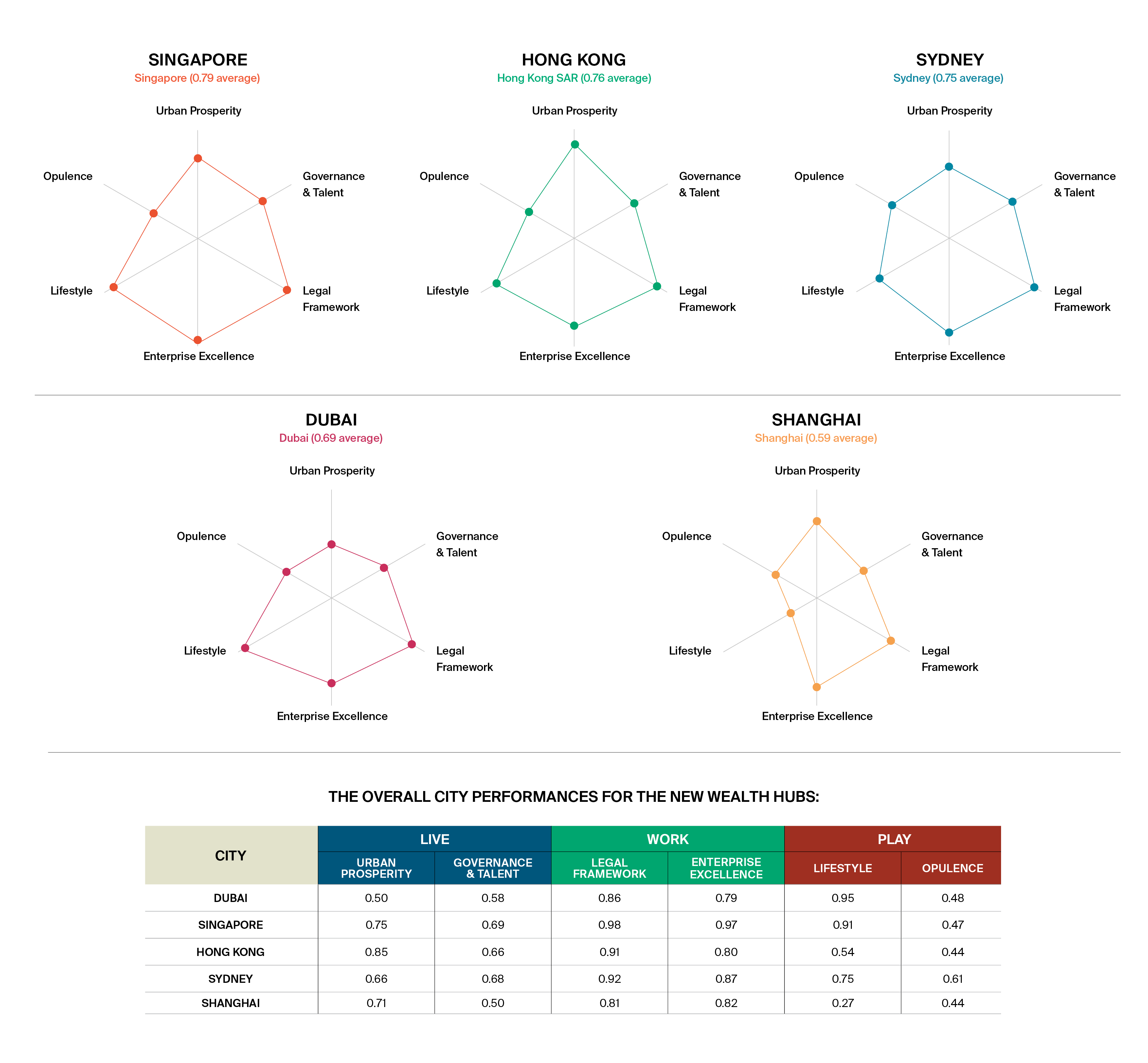 To identify cities deserving recognition as emerging wealth hubs, we analyse the interconnected aspects of work, living, and leisure. A specific group of cities, Singapore, Dubai, Sydney, Hong Kong, and Shanghai - emerge as ascending wealth hubs.