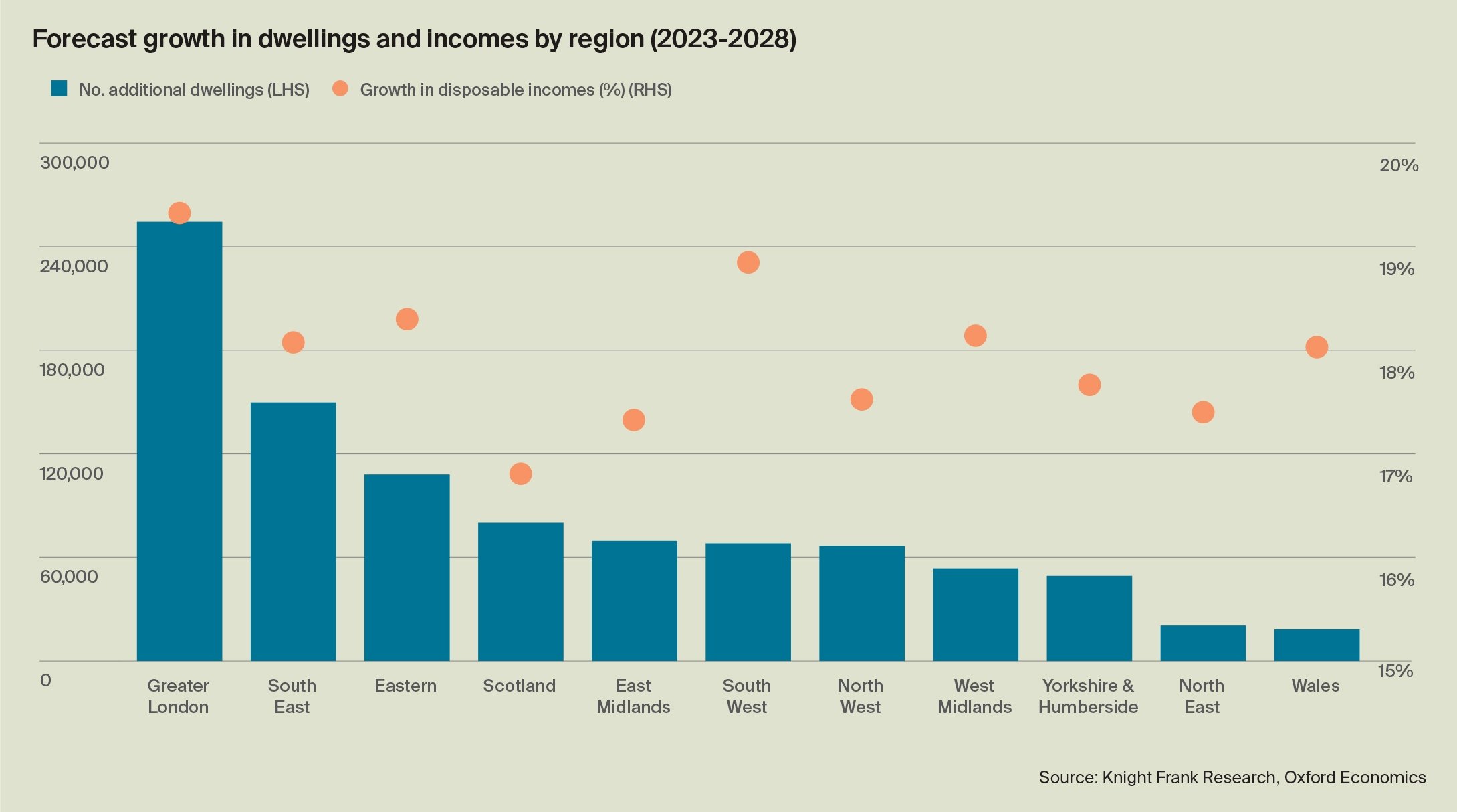 "While all regions are expected to see a rise in the number of dwellings over the next five years, London is expected to record the strongest growth, with an additional 254,450 dwellings anticipated by the end of 2028, or 6.7% growth (Oxford Economics)"