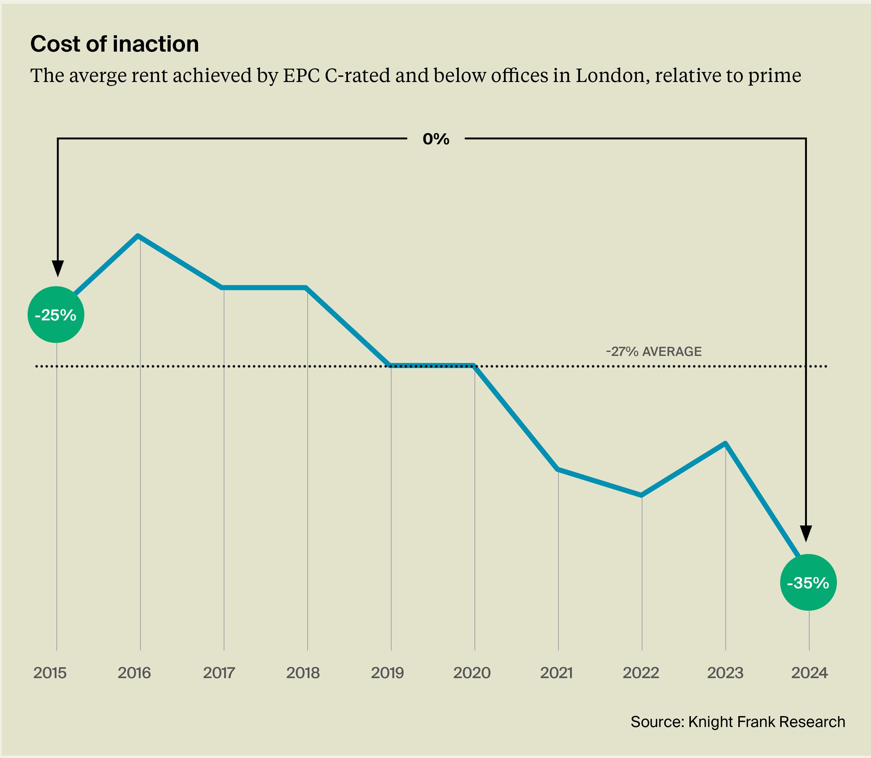 Assessing the potential rental uplift from retrofitting or refurbishing will play a role in determining the overall optimal scenario. Offices which have been retrofitted or refurbished, upgrading from EPC C (or lower) to EPC B or above, often with added amenities, have, on average, seen the gap to prime rental levels narrow by 18 percentage points, see page 4 for details. However, investors should consider the potential value enhancements alongside the level of intervention, the market context, future pipeline, the occupier pool and requirements as there can be wide variation and it requires bespoke asset assessment, as noted on page 3.