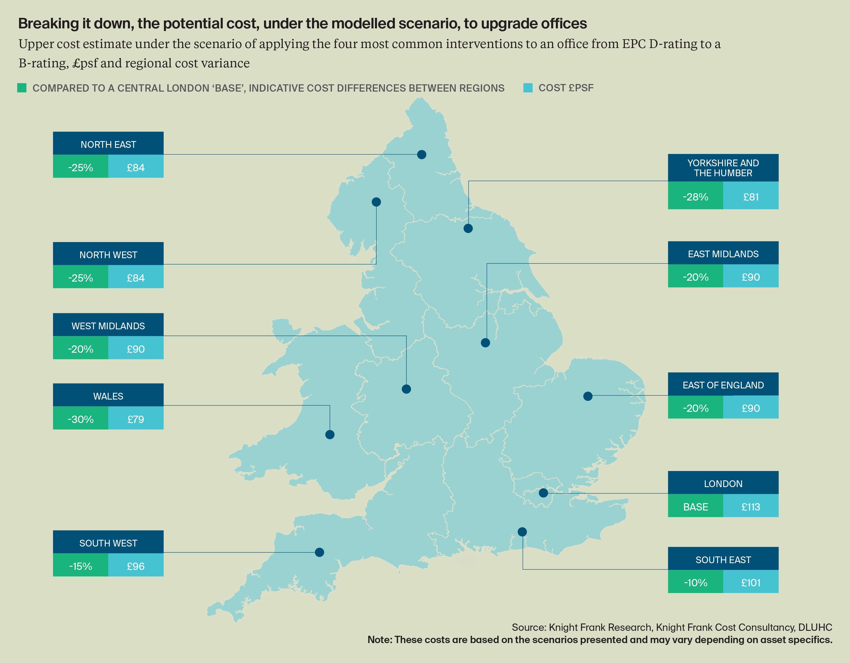 The cost to upgrade will depend on building factors, location, size, interventions required, and amenity provision, making asset-specific assessment critical. Understanding the variance and baseline costs can help narrow down potential strategies. Our hypothetical scenarios, include an EPC D-rated office building in London being upgraded to meet the potential EPC B minimum, which would cost £113 per square foot (psf). When combined with a high level of amenity, see page 12 for details, this would rise to £268 psf. Costs vary greatly with asset specifics as well as location.