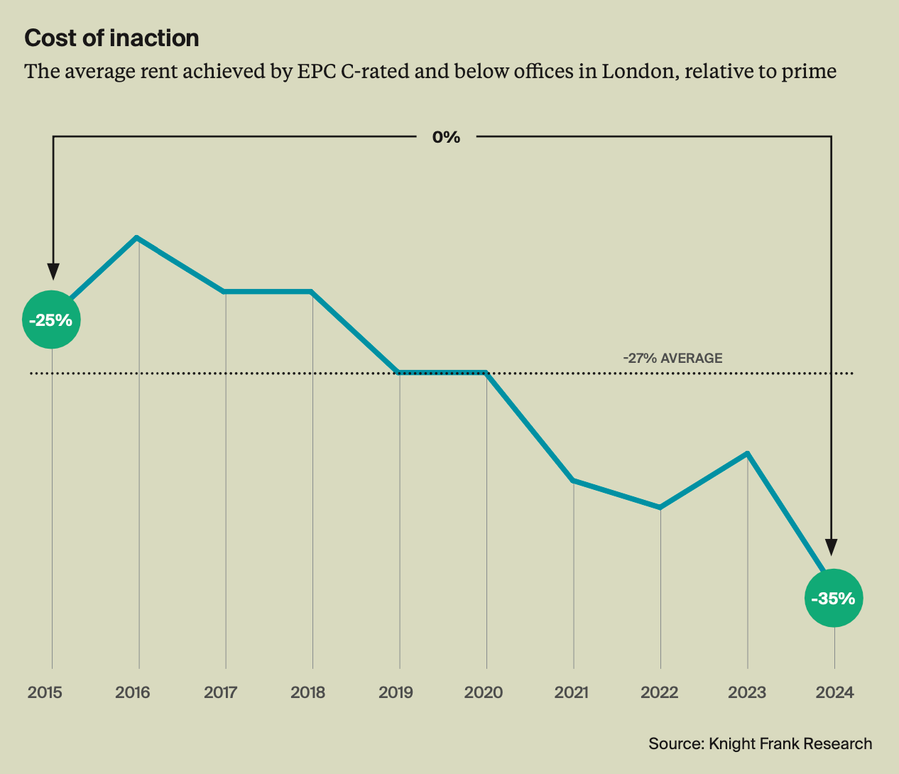 But rent is a small piece of the puzzle. There are exit yields, where higher sustainability credentials can lead to longer lease terms and lower void periods, all potentially lowering the risk premium. In London, for example, the offices that were retrofitted and refurbished between 2020 and 2024 and achieved BREEAM Outstanding or Excellent certification, or an EPC A-rating, were pre-let six months before completion on average.