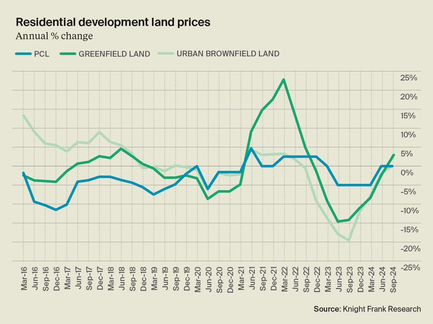 Despite tax risks, the UK's brightening economic outlook is fuelling competition among housebuilders in the land market. Average England greenfield land values rose 3% on both an annual and quarterly basis during the three months through September (see chart). Brownfield and Prime Central London prices remained flat due to thin activity, partly due to Budget uncertainty.