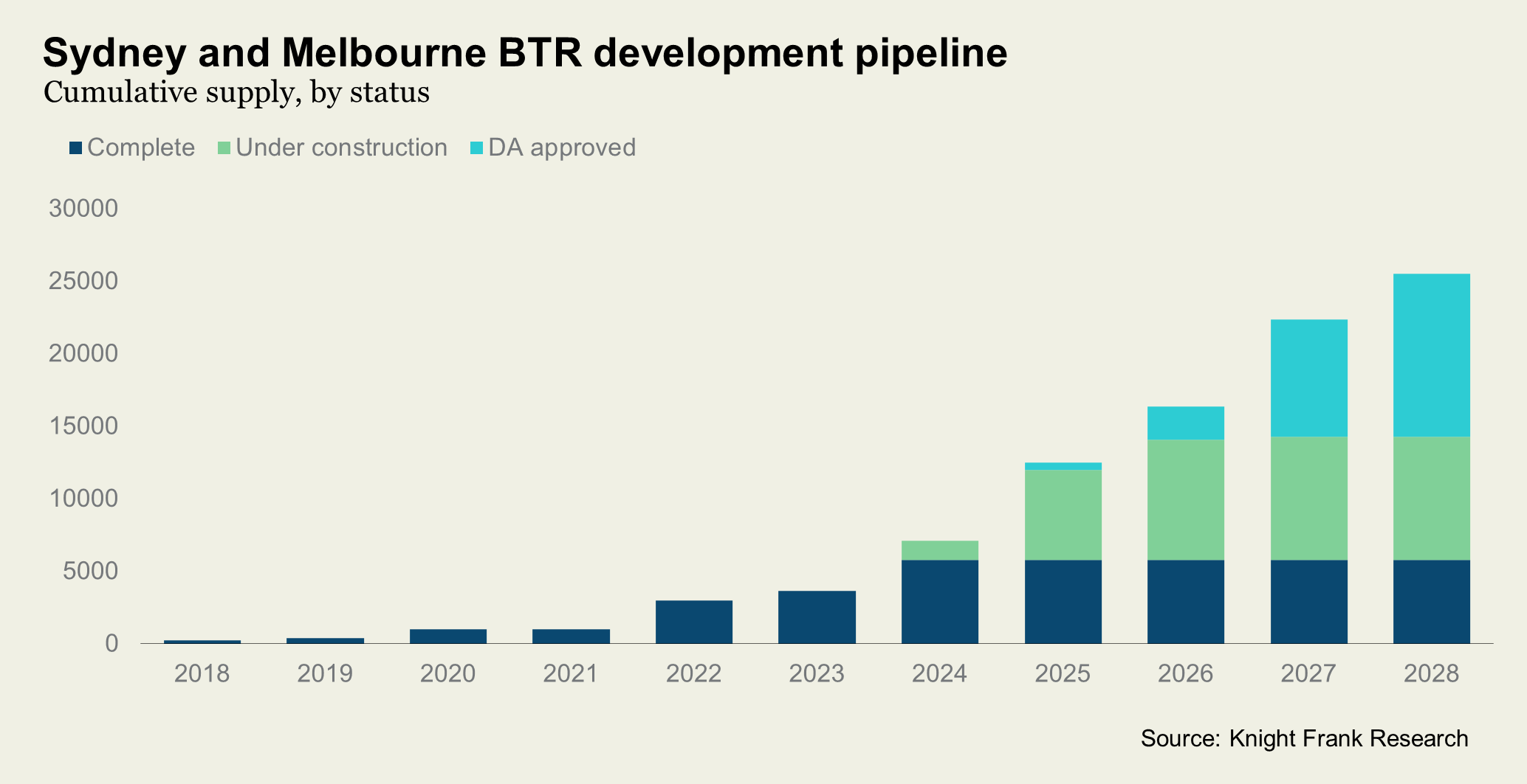 Examples of policy focussed on increasing housing supply are equally compelling. In Sydney and Melbourne, the introduction of supportive policies and tax breaks for the development of more build-to-rent (BTR) homes has supported a significant uptick in construction of such properties, from a few hundred across both territories in 2018 to nearly 6,000 today, more than 70% of total stock, with 20,000 more in the pipeline. Around two thirds of institutional grade BTR projects in Australia by value have been funded by foreign capital, with clear examples of overseas capital partnering with local developers to get a foothold in the market.