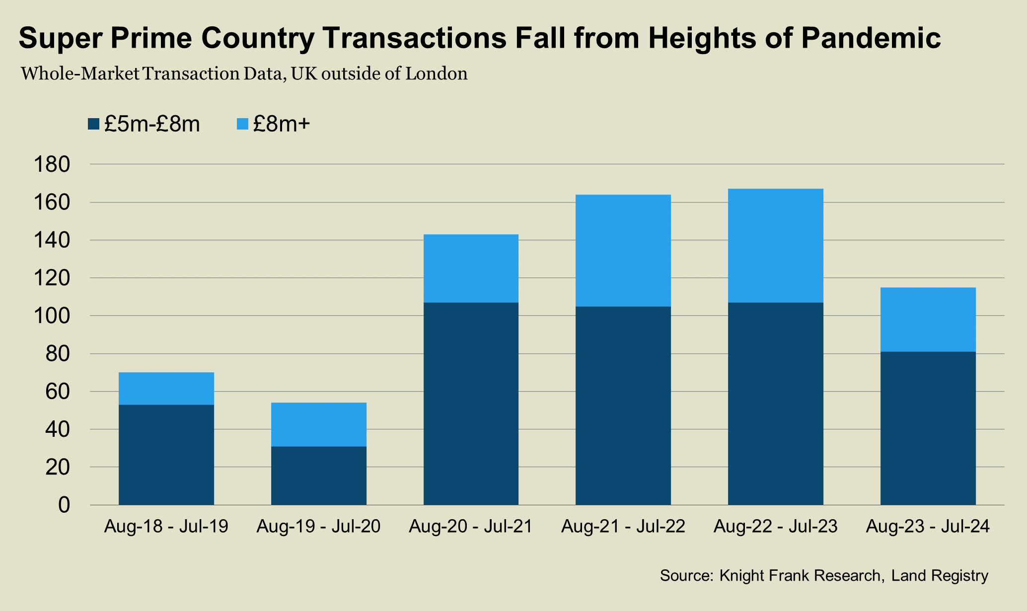 There were 115 deals above £5 million in England and Wales outside London in the year to July 2024, which is down by a third from 167 in the previous 12-month period. Above £8 million, there were 34 transactions versus 60 a year earlier, whole-market data shows.