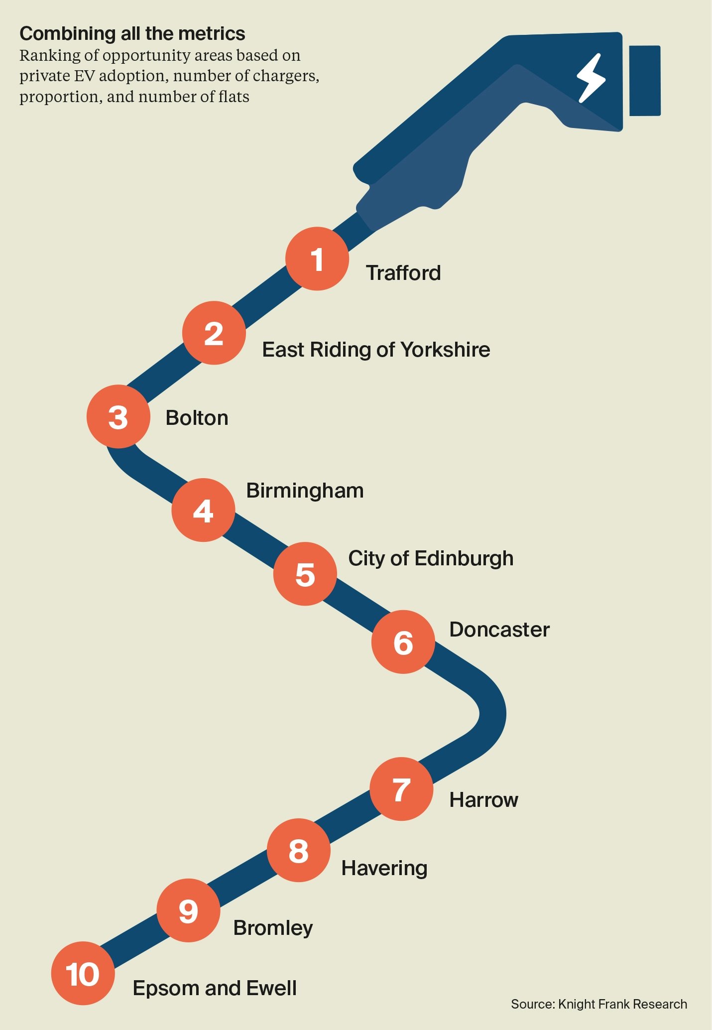 A strategic, blended approach to charger types is essential to future-proof assets. Rapid and ultra-rapid chargers suit hightraffic zones like motorways and retail parks, while slower AC chargers are better suited to residential areas. Our analysis on page 10 spotlights Trafford In Manchester, an area with significant potential for AC growth. A strategy combining AC and DC chargers based on traffic and EV uptake, supports grid management and maximises customer satisfaction, extending dwell times and enhancing property appeal.
