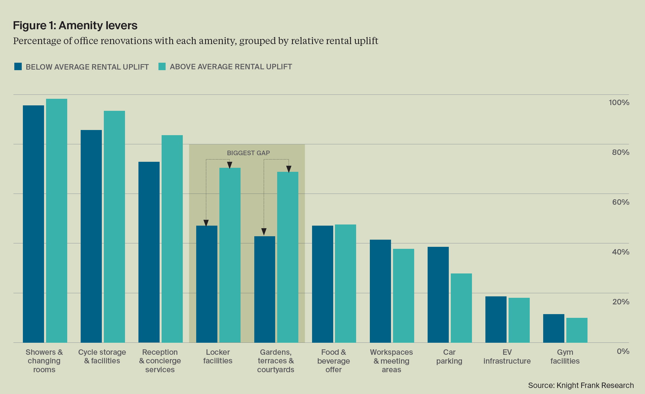 On average, an office retrofit/refurb from an EPC C and below to B and above saw the gap of rent relative to prime close by 18 percentage points. Amenity provision is also key and certain amenities correlate with higher uplifts.