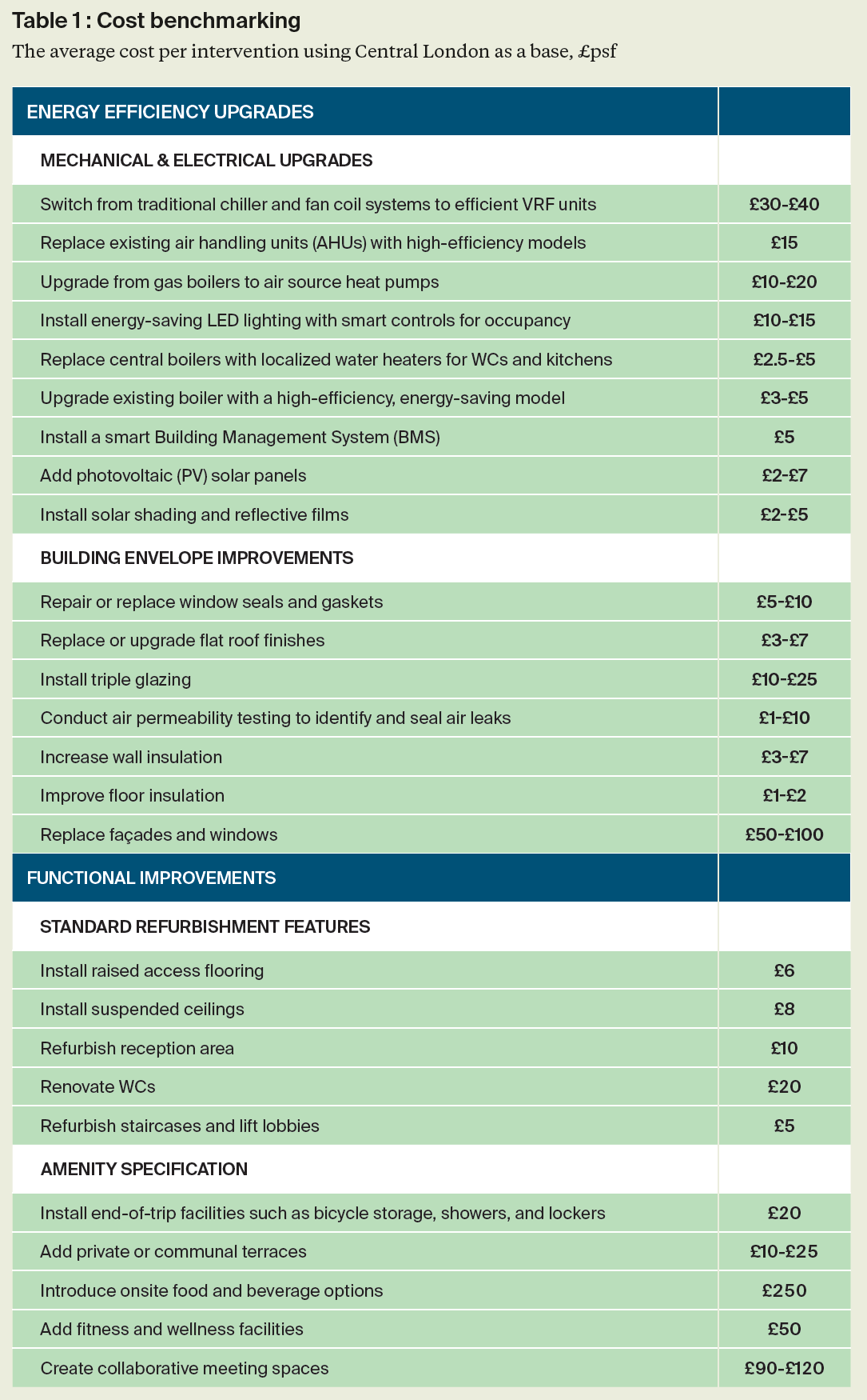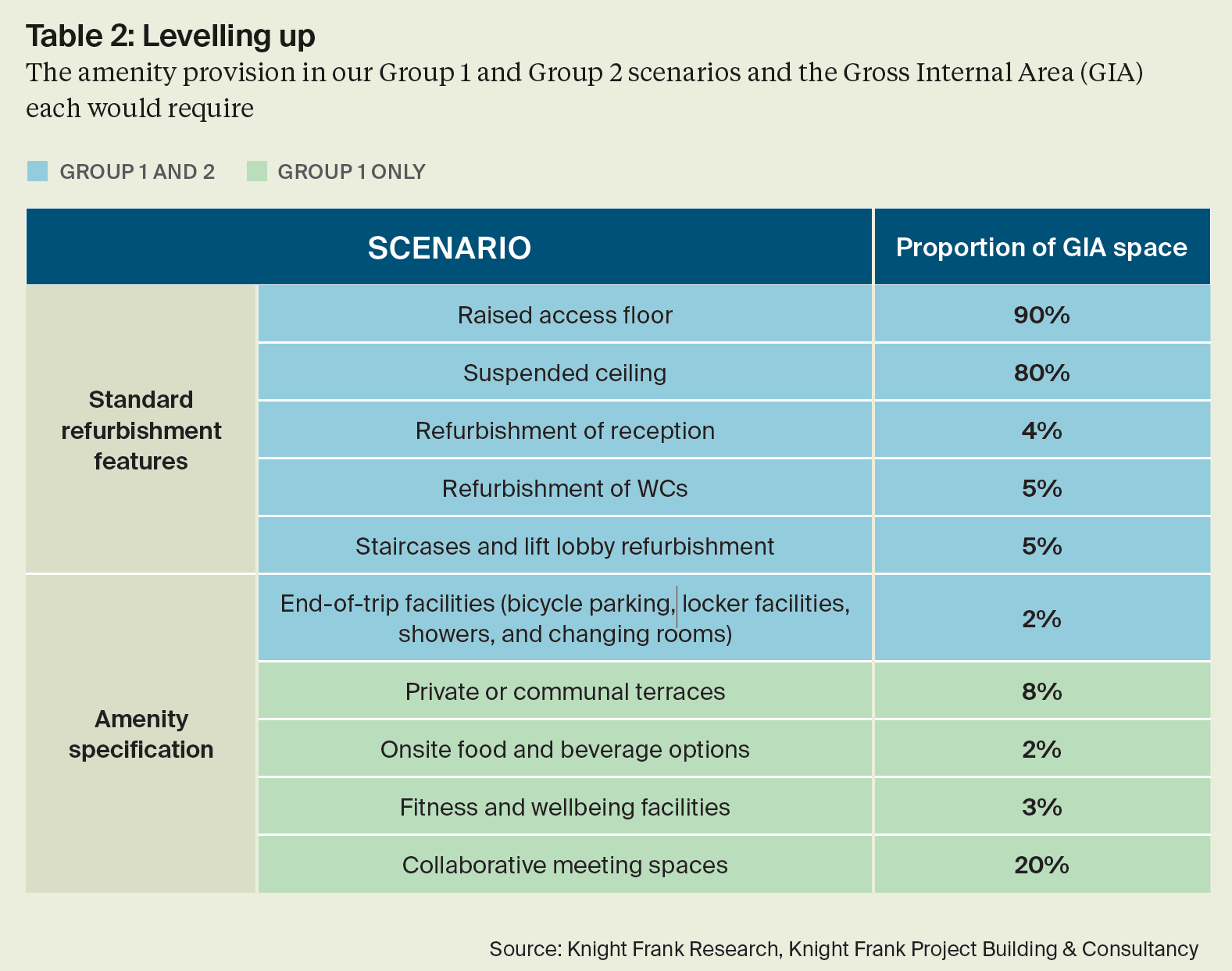 This upside will, of course, need to be balanced by cost implications and can be explored through a number of scenarios. A key one is upgrading to EPC B. Our hypothetical scenario of an EPC D-rated office building in London being upgraded to meet the potential EPC B minimum would cost £113 per square foot (psf). When layering on various amenity levels in our scenario, the cost rises to £268 psf.