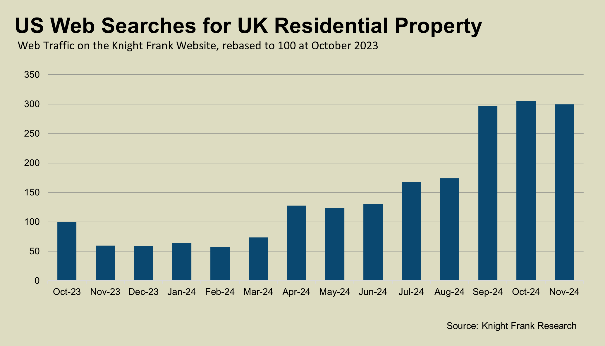 The vote was expected to polarise opinion and Knight Frank web traffic data suggests that was the case. There was a marked increase in searches from the US for UK property in recent months, as the chart below shows. Traffic this November was five times higher than the same month last year.