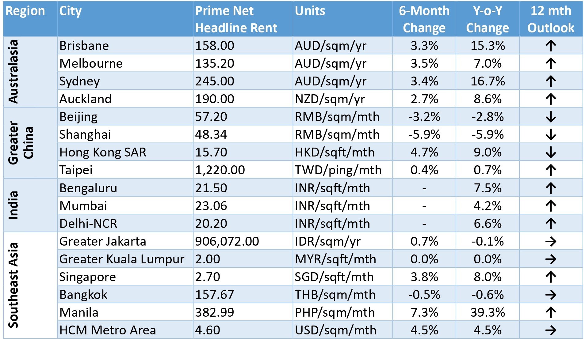 With the outlook turning conservative, occupiers in the region will remain cautious, impacted by economic uncertainty, inflationary pressures and higher interest rates. Rents will remain on an uptrend, but with the structural shortage of quality spaces narrowing, growth will moderate sharply to 1-3% in 2024, down from the over 6% rise in 2023.