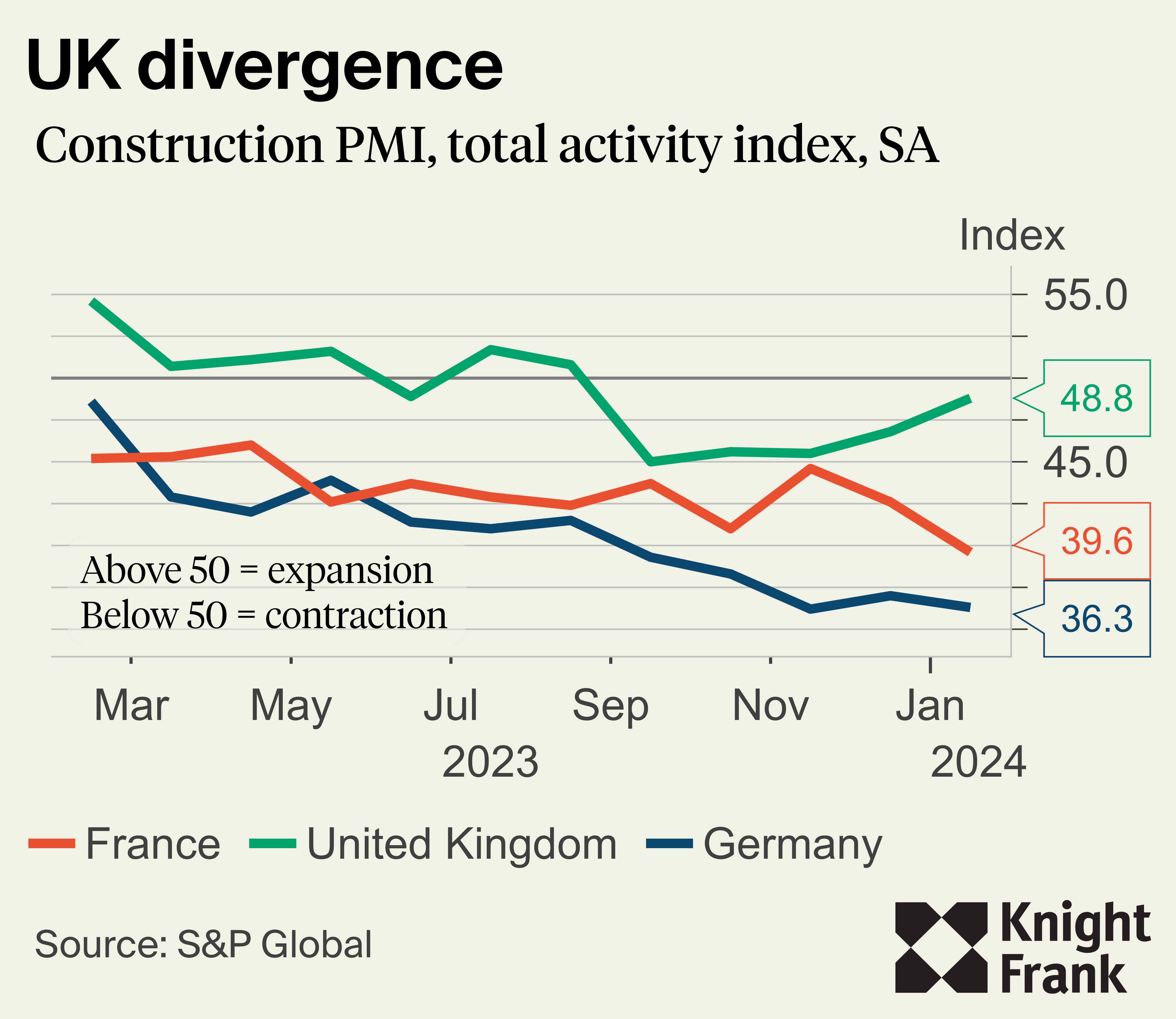 While the UK is inching towards expansion territory for the construction sector, in Germany the property slowdown appears to be deepening, with house building acting as a drag on activity.