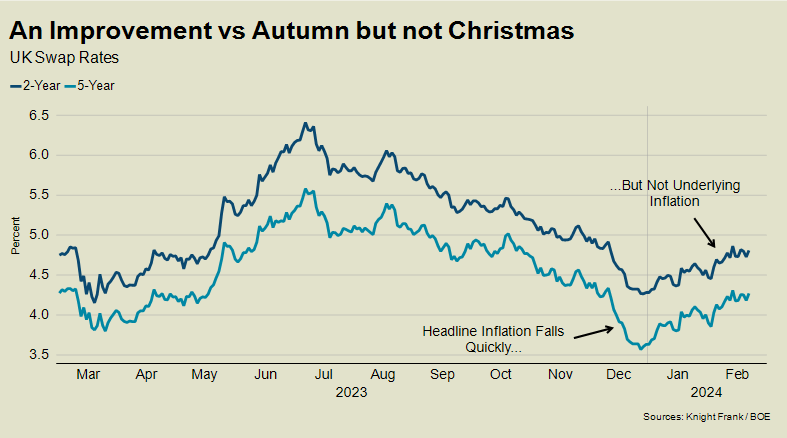 The five-year swap rate (the instrument used to price fixed mortgages of the same length) topped 4.3% last Thursday morning, which compares to less than 3.6% in the period between Christmas and the New Year. The word that comes to mind is “ouch”.
