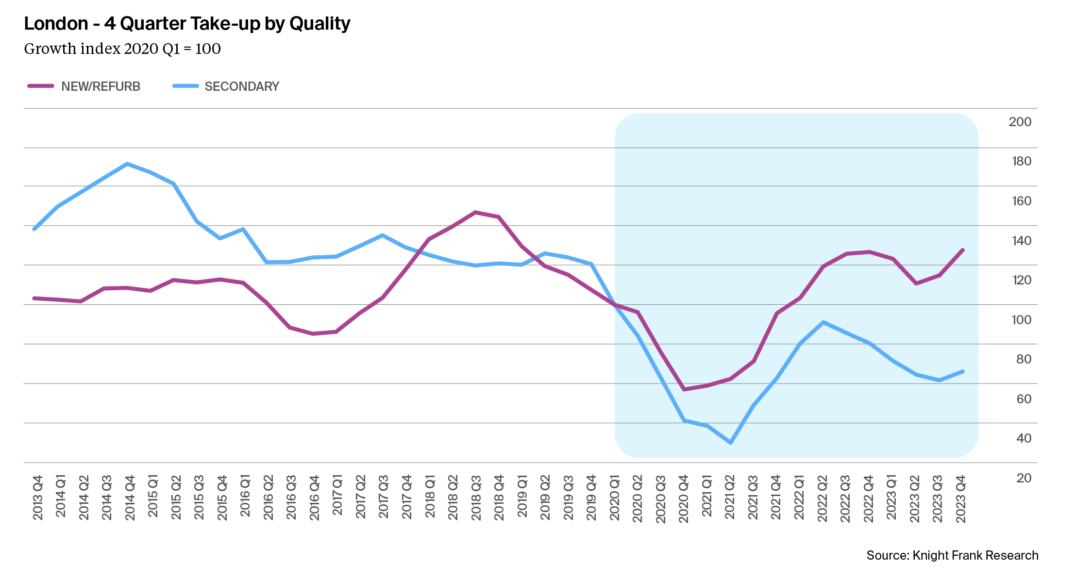 We expect the quality bifurcation of the office market to intensify in 2024. Our recent (Y)OUR SPACE report showed occupiers have sharpened their focus on office space which meets their sustainability ambitions and provides a high level of amenity to support increased office utilisation rates and enhance employee wellbeing. All under the direction of the CEO to help drive productivity in the post-Covid cycle.