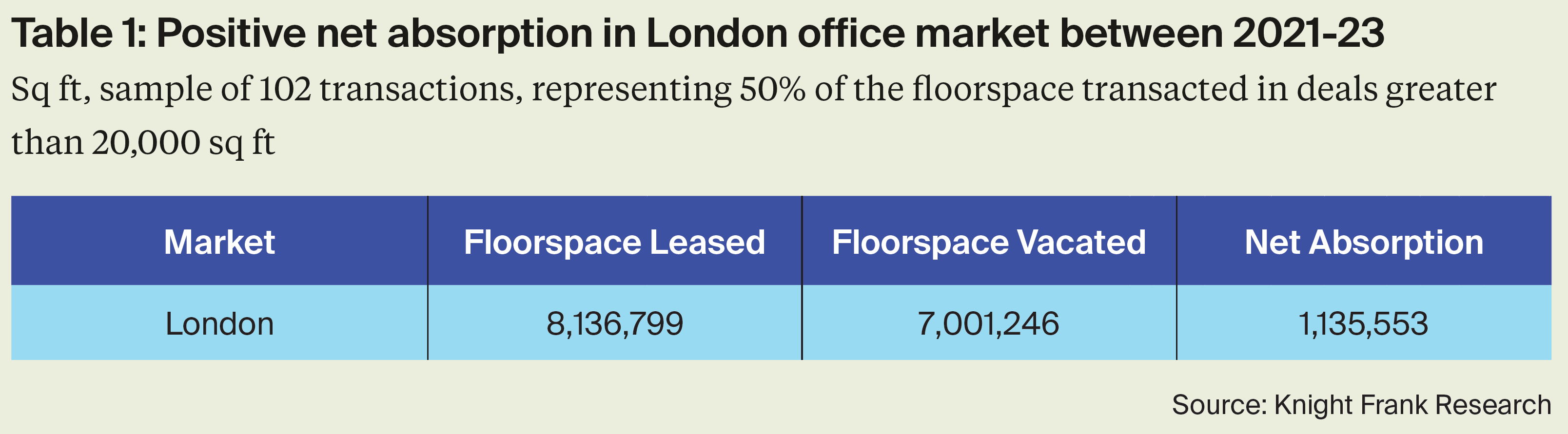 "Our sample shows 8.1m sq ft of positive absorption of office space whilst just over 7m sq ft has been vacated by occupiers. This implies the occupiers in our sample accounted for 1.1m sq ft of net absorption."
