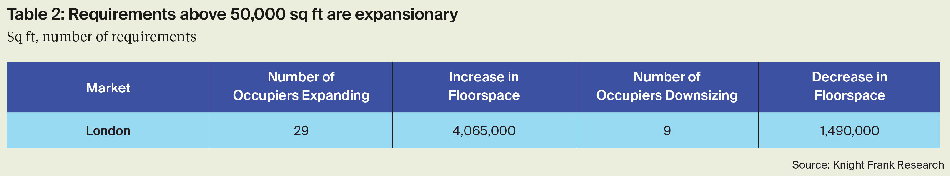 There are 51 requirements – totalling 7.3m sq ft – for offices above 50,000 sq ft. Of these, 29 requirements are expansionary, and nine are contractionary. The remaining 13 requirements are either new entrants or smaller and high growth companies where previous occupancy details have not been disclosed. The expansionary requirements could lead to a net additional floorspace of 4.1m sq ft, whilst the contractionary requirements could bring a net floor space reduction of 1.5m sq ft. This analysis suggests a potential net absorption of 2.6m sq ft over the next 12-18 months.