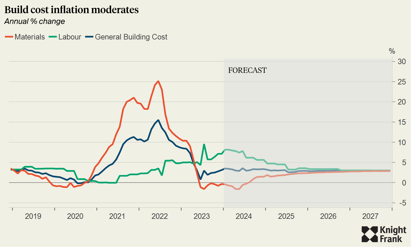 Build cost inflation has already been moderating, down to 3.1% in 2023, from a peak of 15.5% in 2022, according to the BCIS. More stability is anticipated in 2024. Tender pricing is forecast to drop to 1.5% this year, from 3.5% in 2023. Materials and labour costs are also expected to come in notably lower than recent peaks.