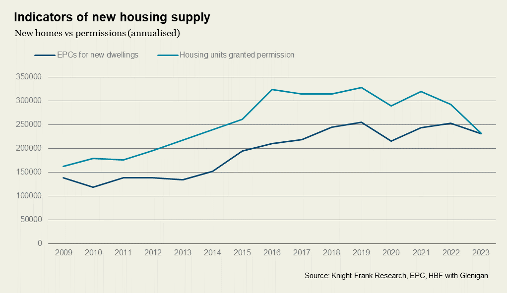 Using EPC data as a proxy for housing completions, that means the number of homes gaining planning consent was just 140 more than the volume of homes which were completed in 2023 (see chart below), the narrowest gap on record. Given a portion of these consents are never built out, it’s a clear signal that housing delivery will fall in the medium term.
