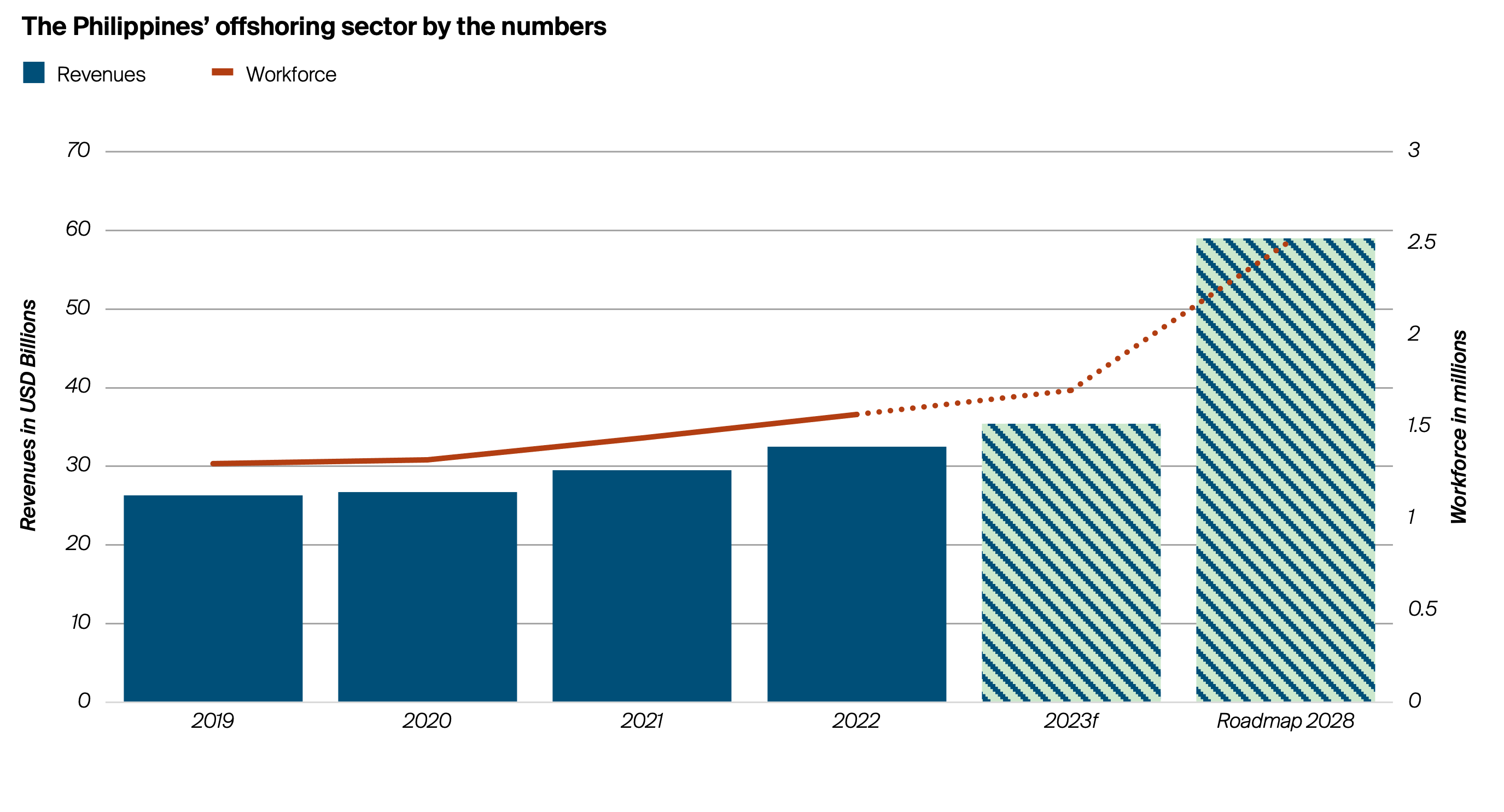 The IT and Business Process Association of the Philippines (IBPAP) has projected significant growth in the country's offshoring sector through its IT-BPM Industry Roadmap 2028. The roadmap estimates that the sector will reach USD 59 billion in revenue and employ 2.5 million people by 2028, indicating a substantial increase in both financial performance and job creation.