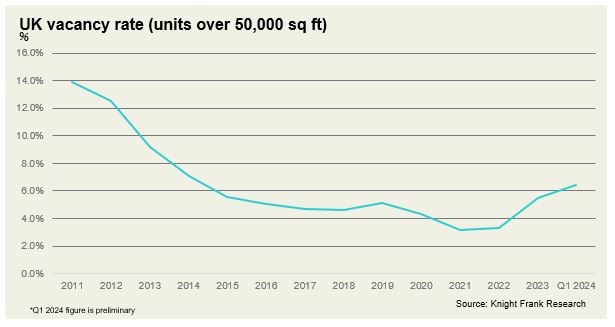 The vacancy rate continues to soften due to a combination of development completions and secondhand space returning to the market. Preliminary figures point to approximately 72 million sq ft of space available (excluding units under construction) at the end of Q1 2024, and a vacancy rate of c.6.4%, up from 5.5% at the end of last year. The Midlands and North West markets in particular, saw availability rise significantly.