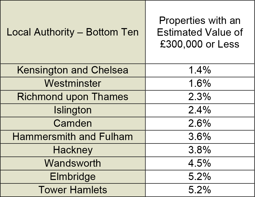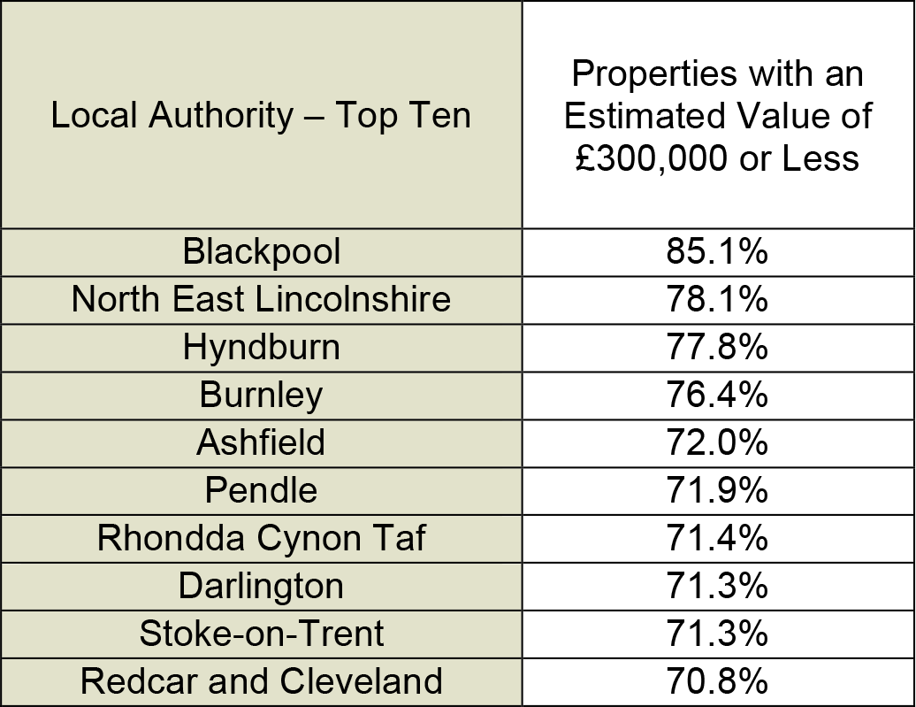 We estimated the percentage of properties in each local authority valued at £300,000 or below – in other words the areas with the highest proportion of properties where the stamp duty bill would be zero. The smallest number was in Kensington & Chelsea (1.4%). The highest was Blackpool (85.1%).