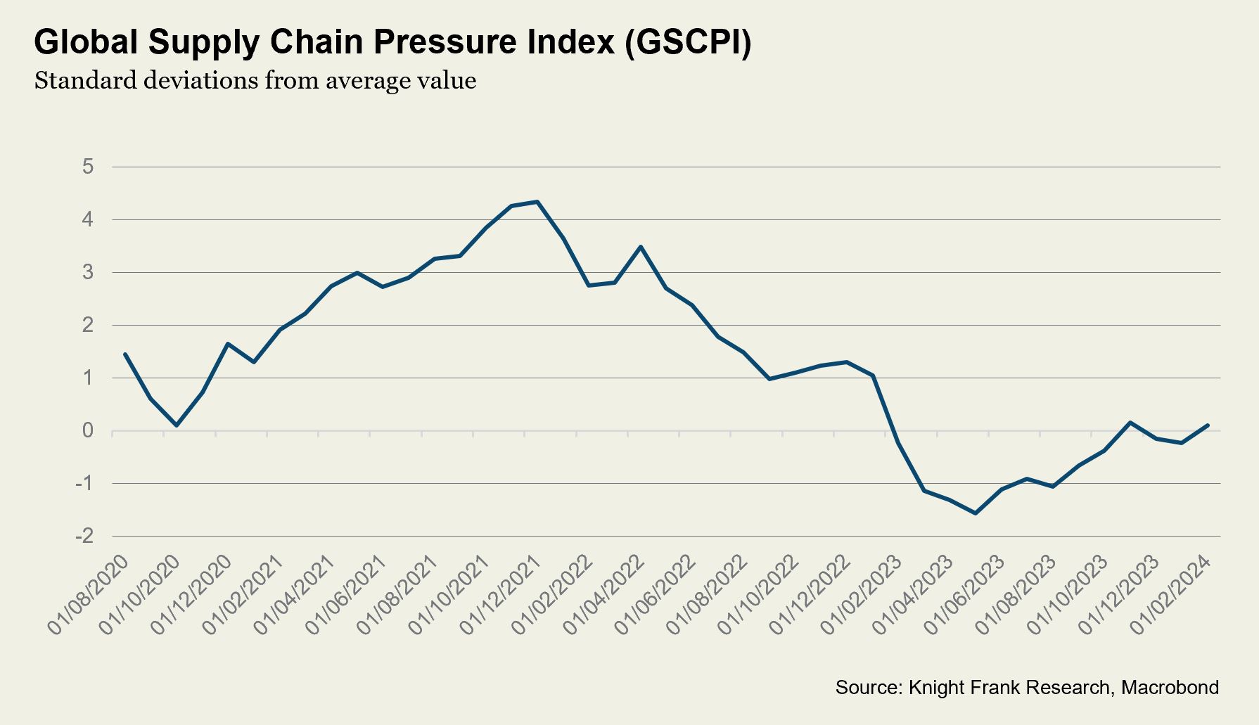 The Suez shipping route that connects Europe with China and East Asia continues to be impacted by the threat from Houthi rebels, who have been attacking commercial and military shipping in the Red Sea since November 2023. Around 30% of global container trade travels through this route, and vessels are currently being forced to take much longer routes (around the southern tip of Africa). These longer transit times are adding to lead times. European manufacturers and retailers that depend on components or products from China and East Asia may seek to increase their stock to protect their order books and continue to service customer demand, which may result in additional demand for warehouses or temporary storage space.