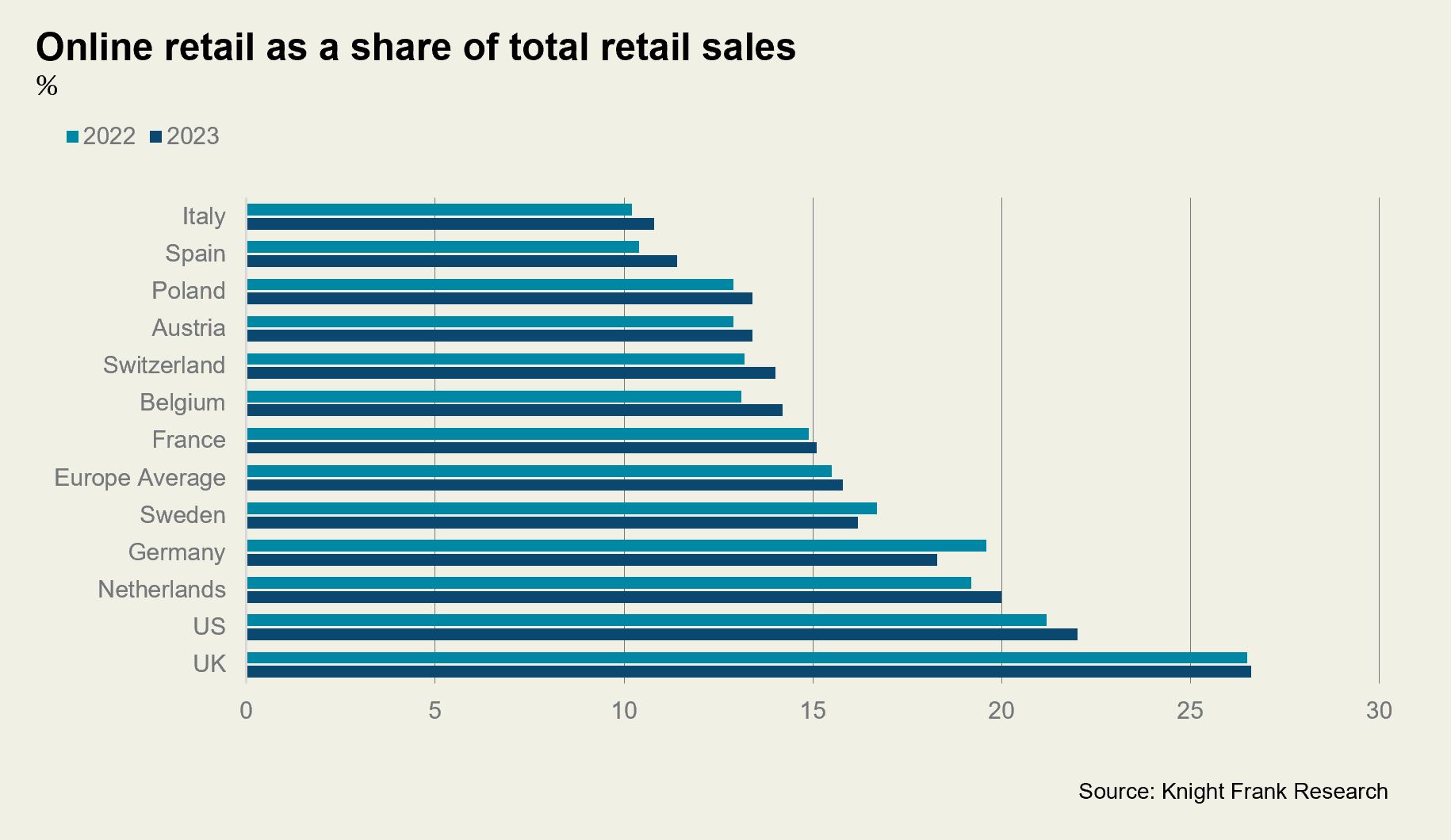 In Italy, online sales accounted for just 10.2% of total retail sales last year, and 10.4% in Spain. Figures for 2023 indicate a rise in penetration rates in these markets to 10.8% and 11.4%, respectively. The growth of these markets will require further development of logistics networks and specialist fulfilment facilities. The current cost of living crisis and associated pressures on household finances may also help support growth, with most shoppers believing the best prices can be found online.