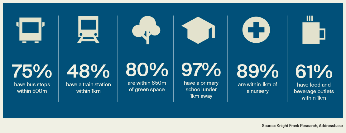 Analysis of 153 completed SFH schemes across the country shows that 75% of homes are located within 500m of public transport infrastructure and 80% are within 650m of a public green space. Given the high proportion of families who live in SFH, access to education is key. The analysis shows that 89% have a nursery within 1km, 97% have a primary school and 60% a secondary school.