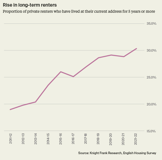 The drop in listings volumes partly reflects the fact that renters are staying in existing properties for longer and moving less often. This means that properties are not cycling back onto the market as quickly or as often as they once did. In 2012, just 19% of all private renters had lived at their current address for more than five years; now that figure is 30%.