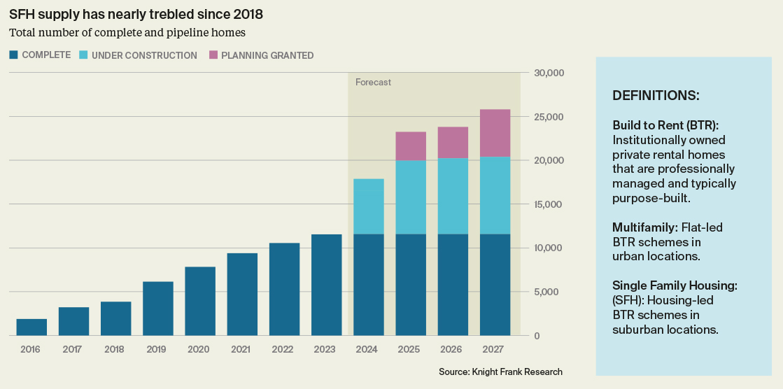 The total number of SFH units in the UK, either existing or proposed, is now just above 26,500, with 11,575 operational and a further 15,000 in the pipeline (under construction or with full planning). The total size of the SFH market, combining both operational homes and pipeline, has nearly trebled since 2018 demonstrating the appetite from developers, investors and lenders for the sector.