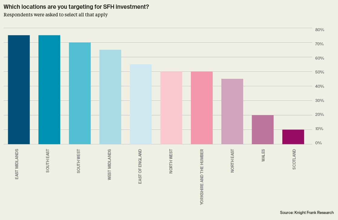 The majority of investors (75%) are targeting locations in the South East and the East Midlands, with 70% targeting the South West and 65% targeting the West Midlands. The results chime with our analysis of the development pipeline, with the geographic distribution of schemes shifting as more regional markets are unlocked.