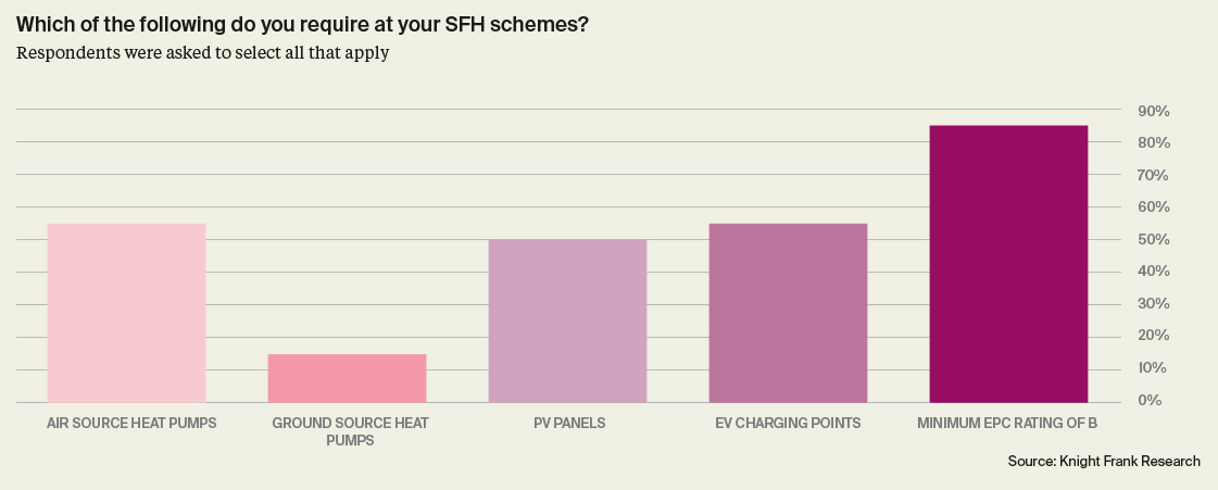 ESG has become common parlance for property investors, including those active in the SFH sector. Some 90% of those surveyed agreed that ESG is an important consideration for their investments into SFH. Demonstrating this focus, we are seeing more investment in sustainable developments. For investors, this is important for futureproofing assets and lowering any potential regulatory risks. Just over half of survey respondents (55%) are planning on installing air source heat pumps and 50% look towards solar energy solutions. EV charging points are required at SFH schemes by 55% of investors.