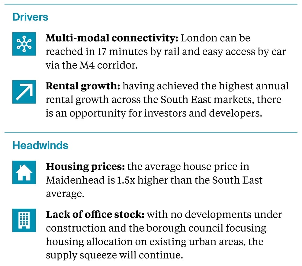 London at £52.50 per sq ft. Maidenhead’s town centre has the highest year-on-year rental growth of any town across the South East markets at 21%. Investors and developers can reap the returns from rental growth, which may make it viable to begin the construction of proposed developments.