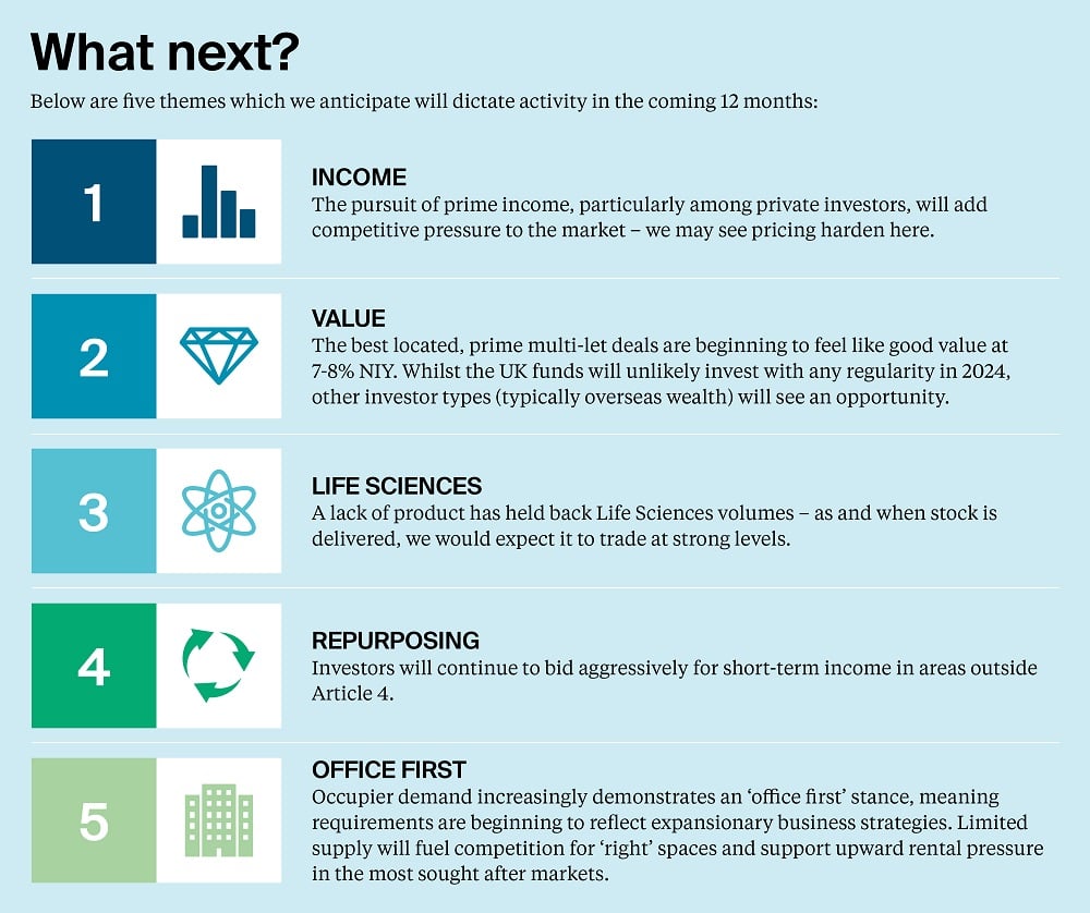 Private investors, particularly from the Middle East, have grown in number in recent months and shown particular interest in secure, longincome streams. In Q3 2023, the Kia HQ in Walton-on-Thames transacted at 7.00%, and 22 Market Street in Maidenhead at 7.28% - both 11 years income, purchased by Kuwaiti money. The pursuit of prime and income will be the mainstay of the market in 2024.
