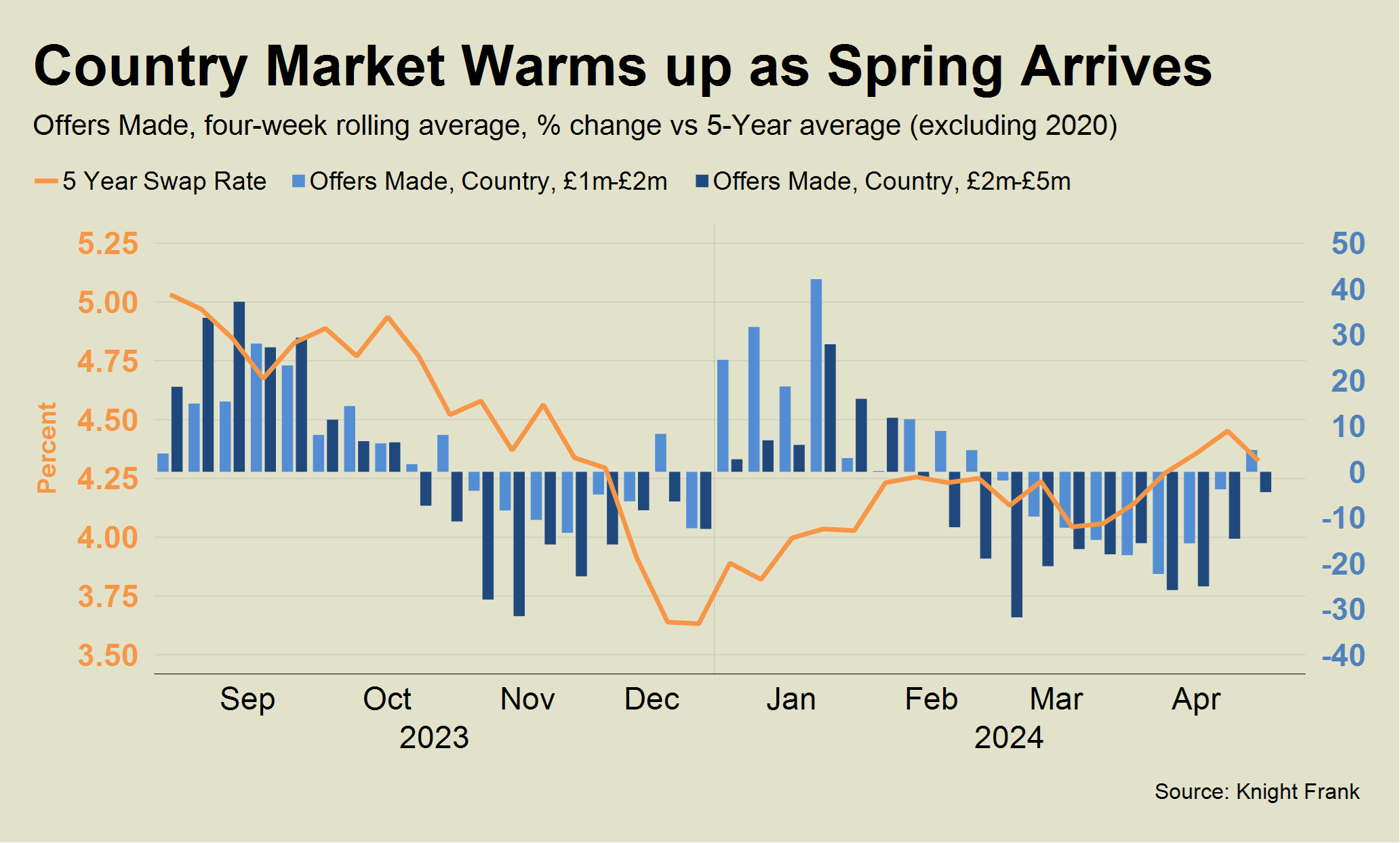 Despite the poor weather, the number of offers made between £1 million and £2 million in the Country was 5% higher than the five-year average (excluding 2020) in the four weeks to last Friday. When you consider how strong the market was in spring 2021 and 2022 during the ‘escape to the country’ boom, that’s a high bar.