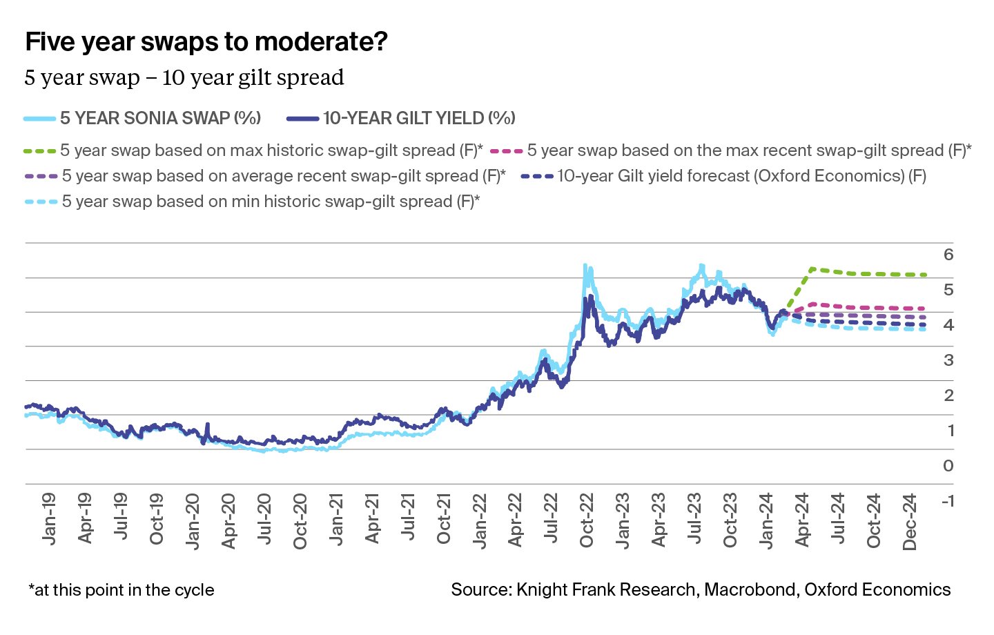 If the 5 year swap to 10 year gilt spread doesn’t exceed recent levels, based on Oxford Economics 10 year gilt forecasts for 2024, we could see a moderation of swap rates, but still at a rate higher than loans originated in 2019, assuming a 5 year loan term.