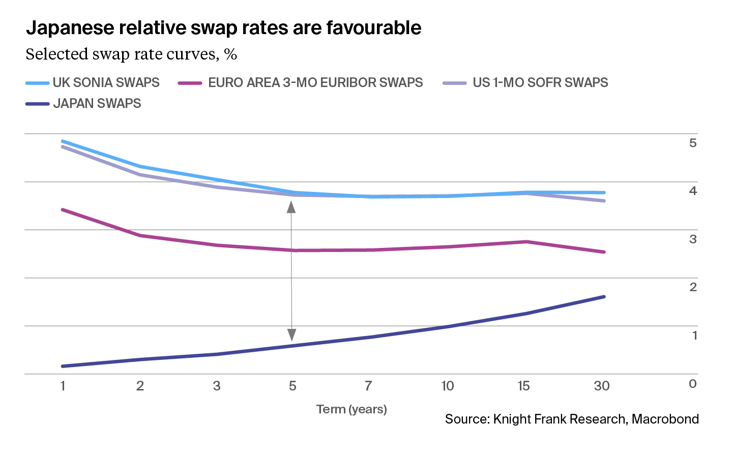 Our Active Capital research suggests a significant increase in activity from Japanese investors supported by a favourable differential in swap rates, opportunity to take advantage of thinner competition and expectations of an appreciating yen. Even last year, from a position outside the top 10, Japanese investors increased to become the second largest global cross-border investors in the office sector.