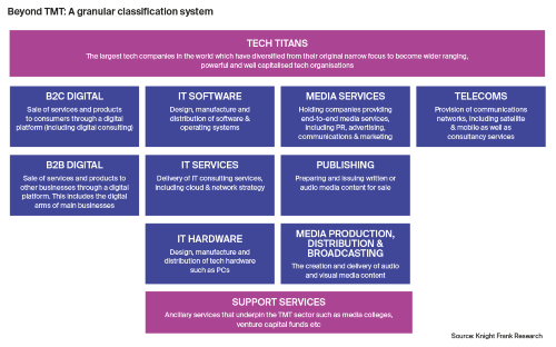 This is not to suggest that the more traditional components of the TMT sector are no longer relevant. IT software is the tech sub-sector generating the greatest number of requirements – with 12 current requirements and a combined need of more than 350,000 sq ft. This demand corresponds with the growth and potential of Software-as-a-Service business models, as recognised by venture capital (VC) investors.