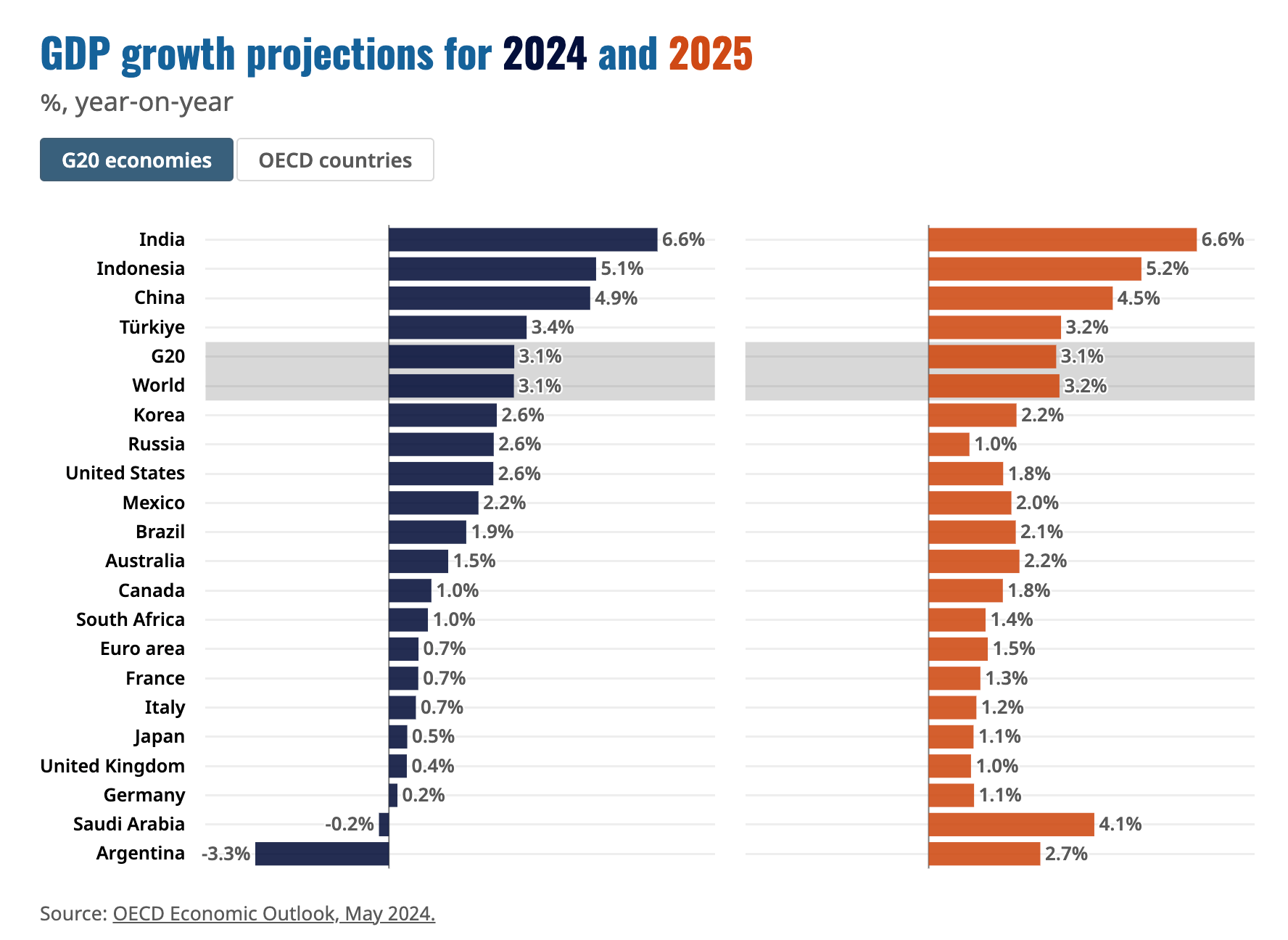 Global economic growth came in above 3% last year, despite the drag exerted by tighter financial conditions and conflicts in Europe and the Middle East. New forecasts from the OECD suggest we'll see that rate of growth maintained through 2024 and 2025.