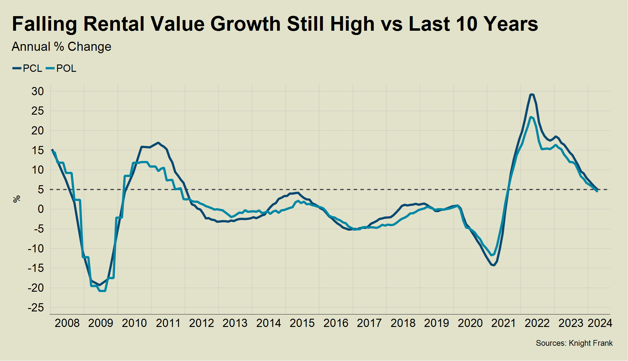 Rental value growth in prime London postcodes has narrowed to levels last seen in the summer of 2021.