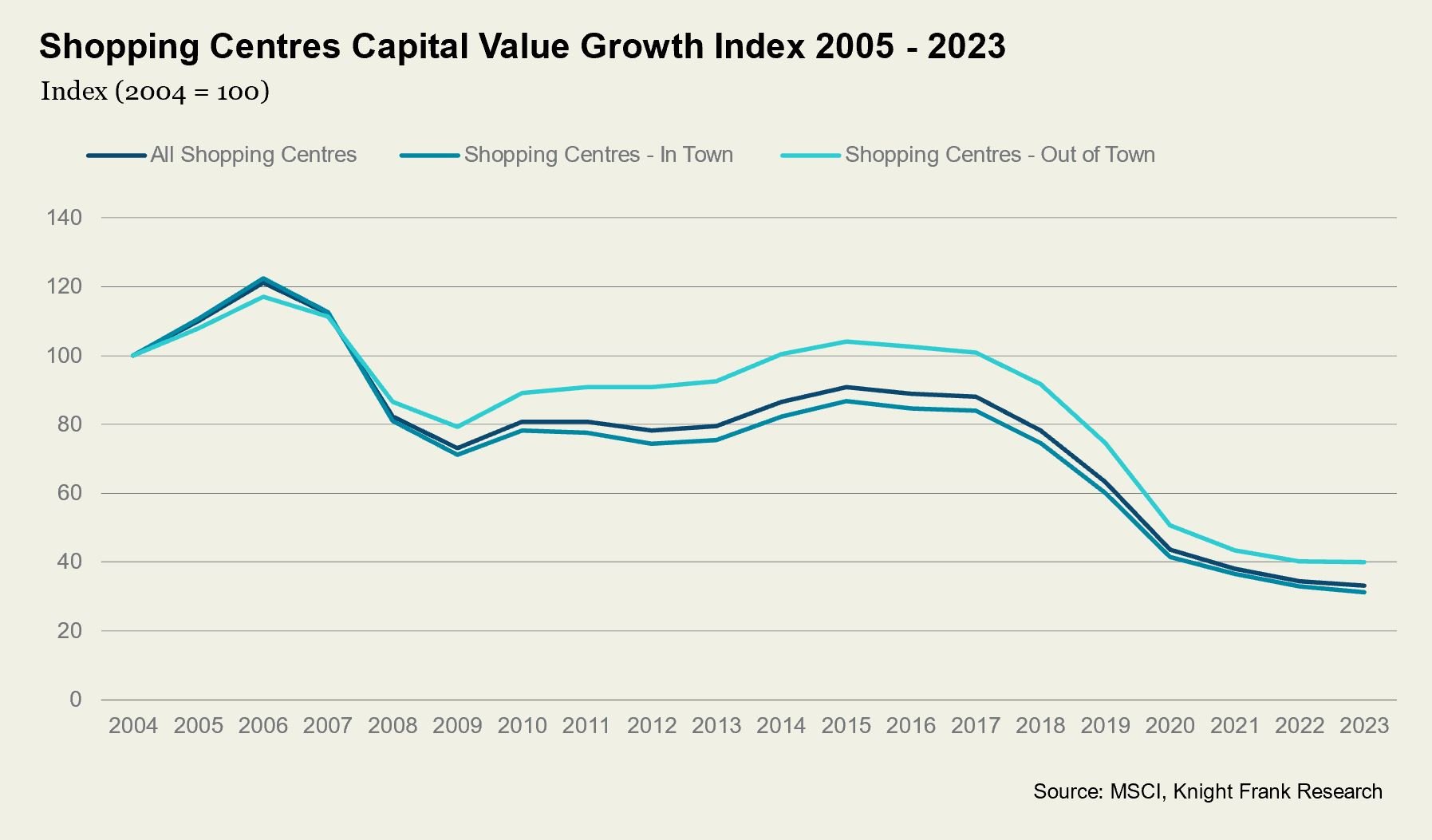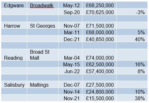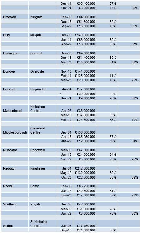 To look for trends, we considered centres that traded in 2005-2007, again in 2012-2015 and have subsequently re-traded again since the COVID-19 pandemic. These triple trades generally give clear, factual evidence of value movements at a point in time.