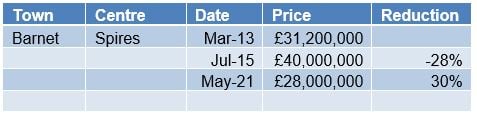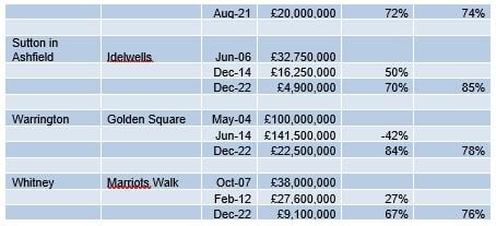 This is the bracket where most centres fell, showing the typical loss of 30-50% between 2005 and 2015 and then a further 60-80% loss at the subsequent post-Covid trade. With lenders’ LTVs around 85%+ pre financial crash and 50-70% post financial crash, it’s easy to see how many assets ended up back with the banks.