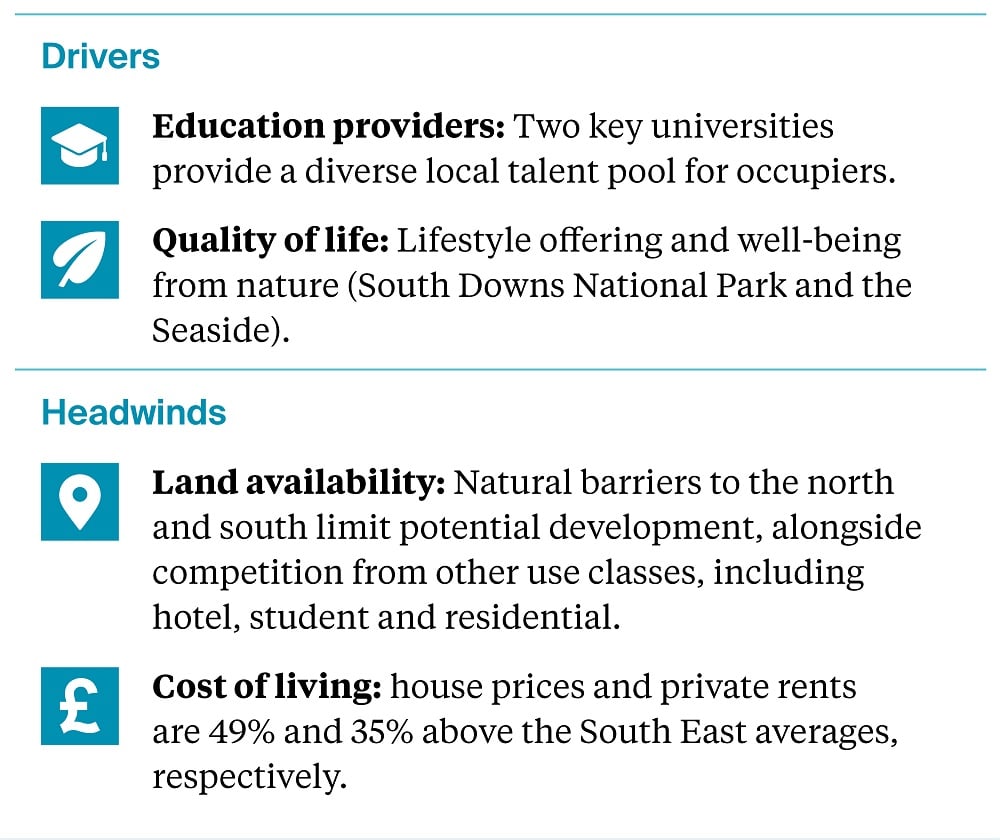 There is good reason to be optimistic about Brighton as an office market. Continued rental growth owing to a lack of supply provides an opportunity for investors, whilst the current prime rent of £42.50 offers a discount to occupiers compared to other key South East markets. Brighton has seen rental growth of 31% since before the pandemic in 2019 and currently commands quoting rents of £45.00 per sq ft for the best quality space. Although there is a lack of land availability due to the natural barriers of the South Downs National Park to the north and the sea to the South, the supply and demand imbalance drives rental growth.