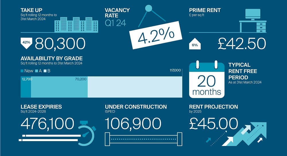 The drivers of occupier demand are changing. Although the Technology and specifically Gaming sectors are principal clusters, this has not translated into occupier demand recently. Professional Services, Business Services and Financial occupiers have been growing in activity, with leading names such as NatWest, Knights Plc and Close Brothers all taking grade A space in the best available buildings. Over the past year, letting activity has been underpinned by demand from the Financial and Business services sectors, accounting for over two-thirds of take-up in 2023.