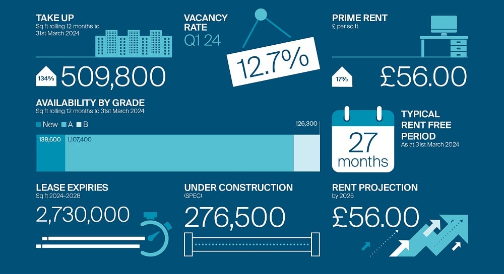 Activity in the out-of-town market has dominated in recent years at nearly double the amount of take-up in the town centre. However, the first quarter of 2024 has bucked this trend, with town centre activity representing 75% of takeup and recording the two largest lettings of the year so far. Further larger transactions in the town centre are expected, with four deals between 15,000 – 40,000 sq ft currently under offer, restoring the historical balance of circa 50:50 between the sub-markets.
